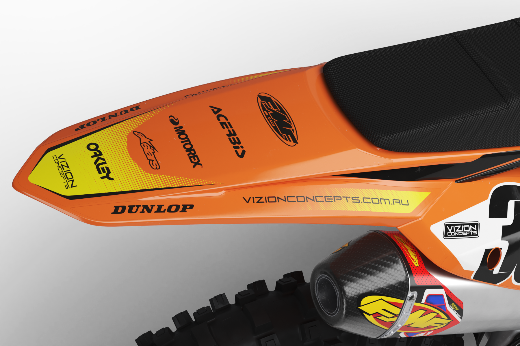 Own the unmistakable KTM look with the Flagship Graphics Kit — a design that celebrates KTM’s iconic orange with a sharp, factory-inspired race finish. Featuring a bright orange base, bold black KTM branding, and oversized race numbers, this kit delivers a clean yet aggressive style that’s instantly recognisable on the track.