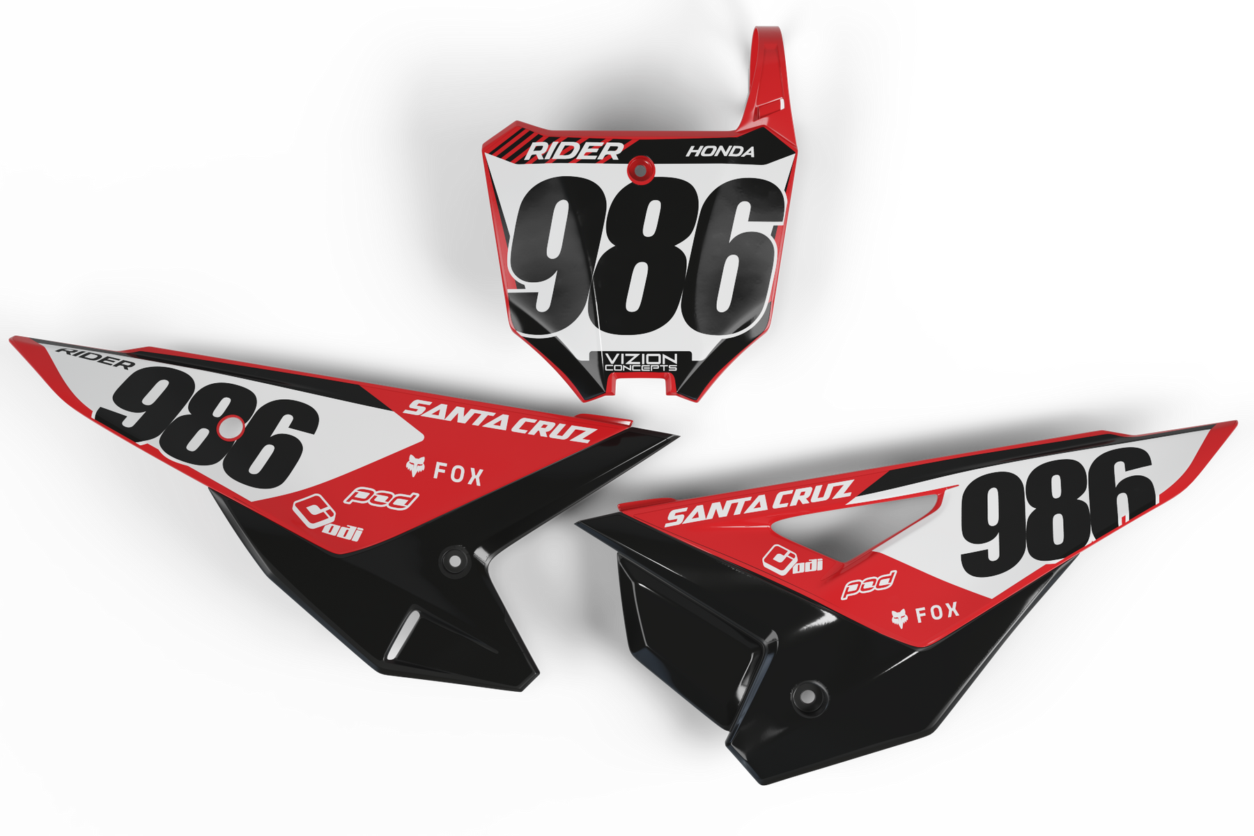 Stand out on the track with the Honda Twist Pre-Designed Number Plates. Featuring a bold red, black, and white race-inspired design, this kit brings an aggressive factory look with sharp angles and sponsor branding for maximum impact.