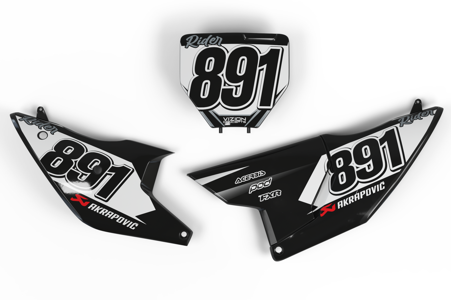 Turn heads at the track with the Shred Pre-Designed Number Plates. Built for riders who want a bold and aggressive look, the Shred kit features a black + white split layout with sharp angles and striking number blocks, accented by sponsor-style logos for a pro-level finish.