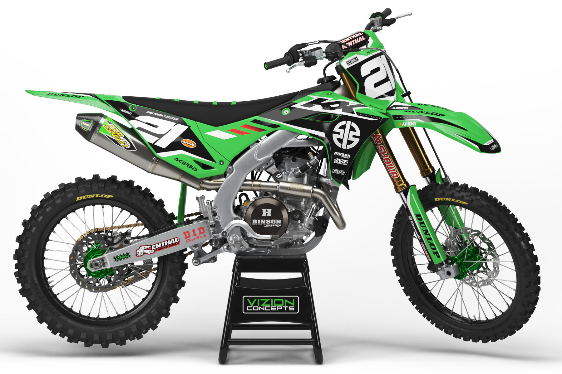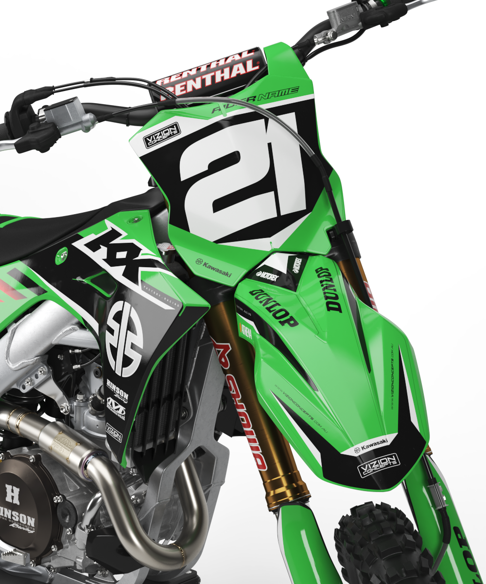 The Kawasaki Viper Graphics Kit delivers a sharp factory race look with aggressive lines and modern detailing, designed to complement Kawasaki’s KX platform. Printed on premium motocross-grade vinyl and precision-cut for Kawasaki fitment, this kit is built to handle hard riding, pressure washing, and long-term abuse while maintaining a crisp, professional finish.