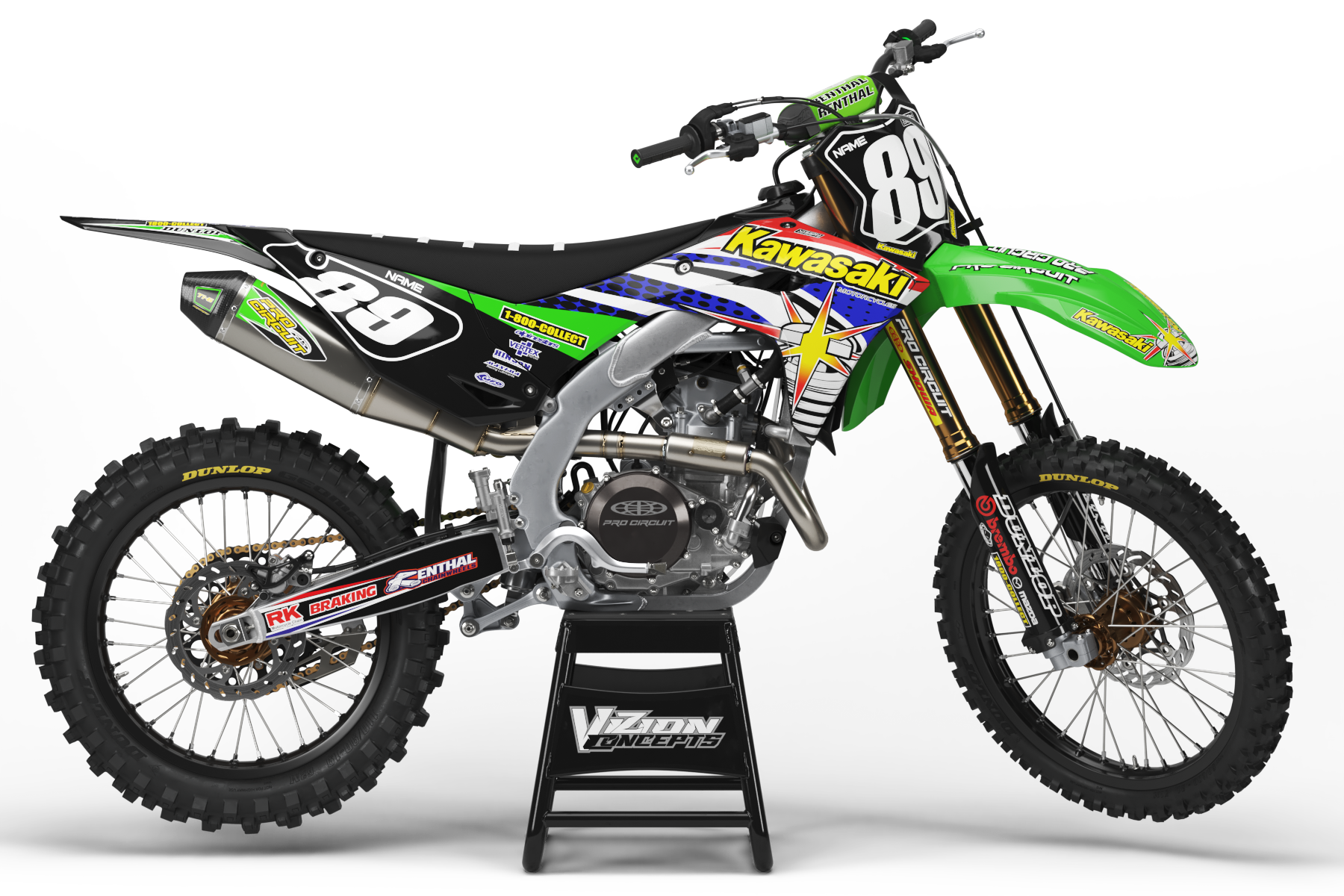 Turn heads at the track with the V-Fire Graphics Kit. Inspired by classic freestyle and factory race vibes, this design combines retro stars and bold color fades with modern Kawasaki styling for a kit that stands out from the pack.