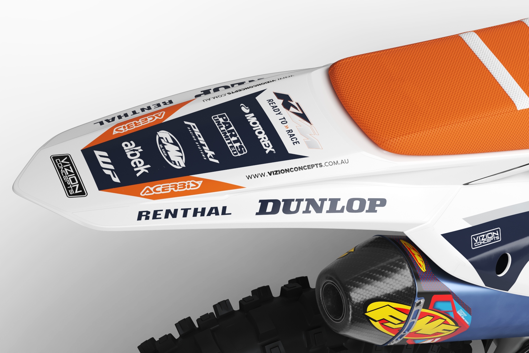 The Warp kit uses oversized number panels, aggressive sponsor placements, and precision-cut lines to deliver a professional, factory-level finish. Printed on premium high-tack motocross vinyl and finished with pro-grade laminate, it’s engineered to handle heavy roost, mud, UV exposure, and high-pressure washing without fading or peeling.