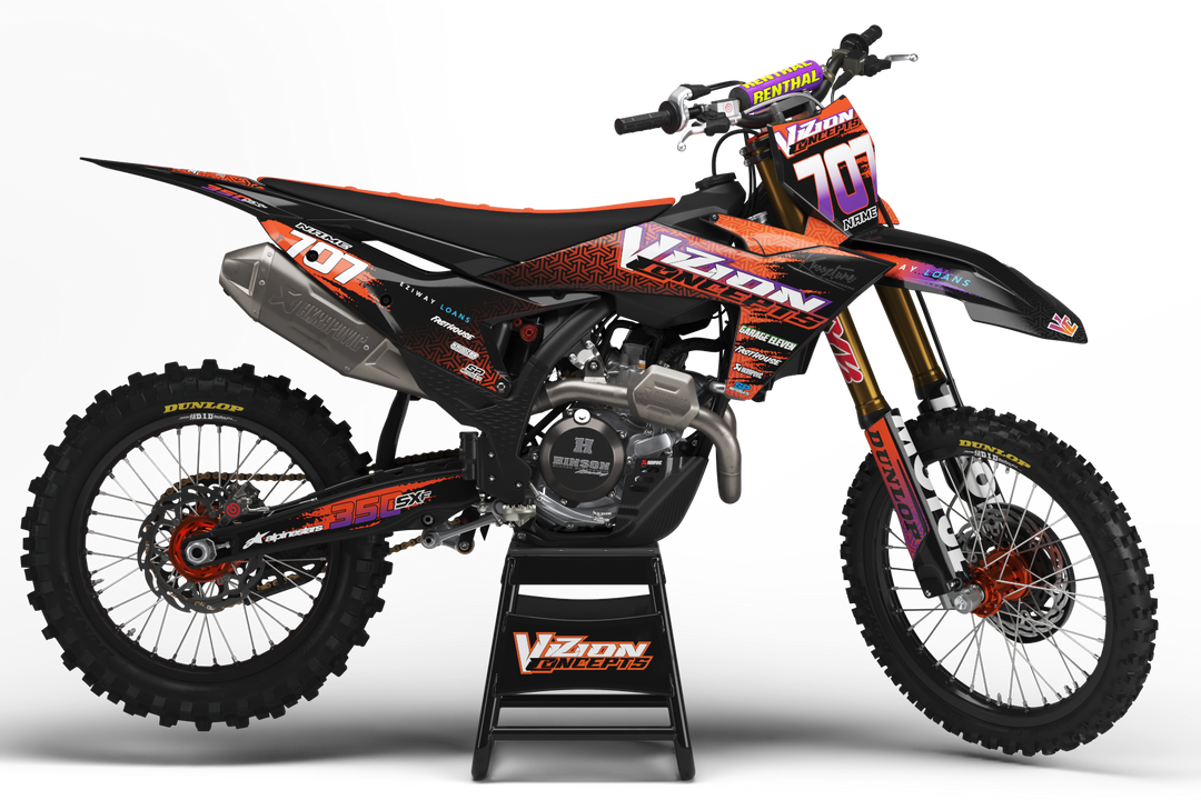 Custom graphics kits for KTM motocross and enduro bikes including SX, SX-F, EXC, EXC-F, XC, XC-F, and XC-W models. Designed in Australia using premium vinyl and laminates, our KTM decals give your bike a bold, race-ready look built to last.