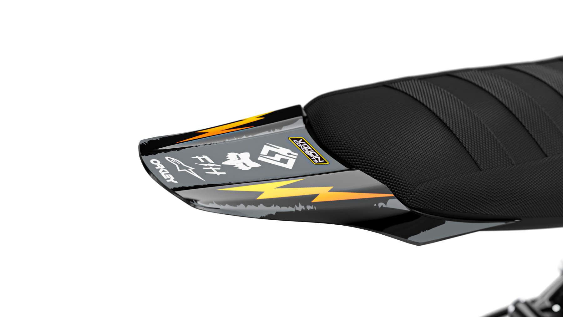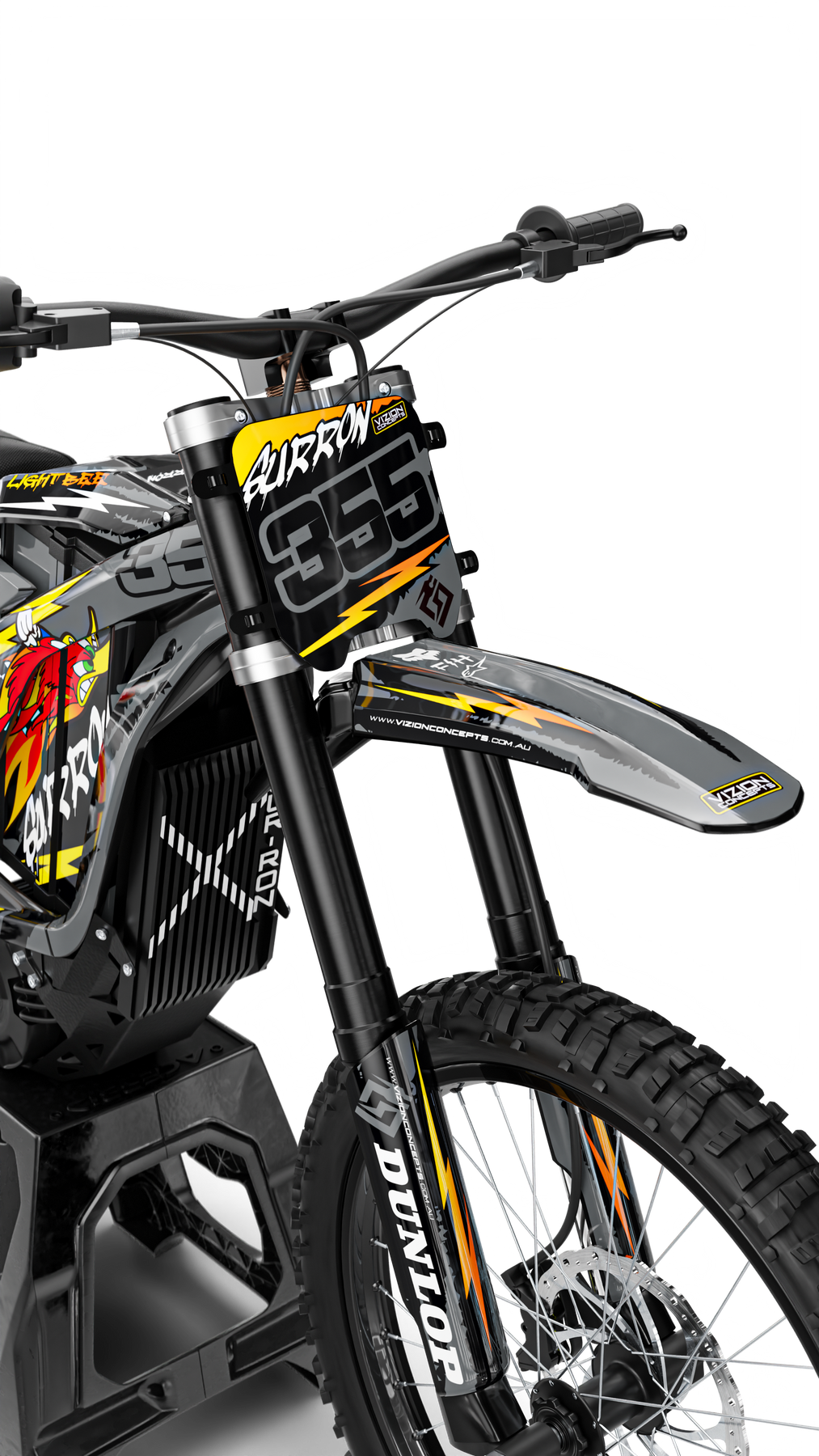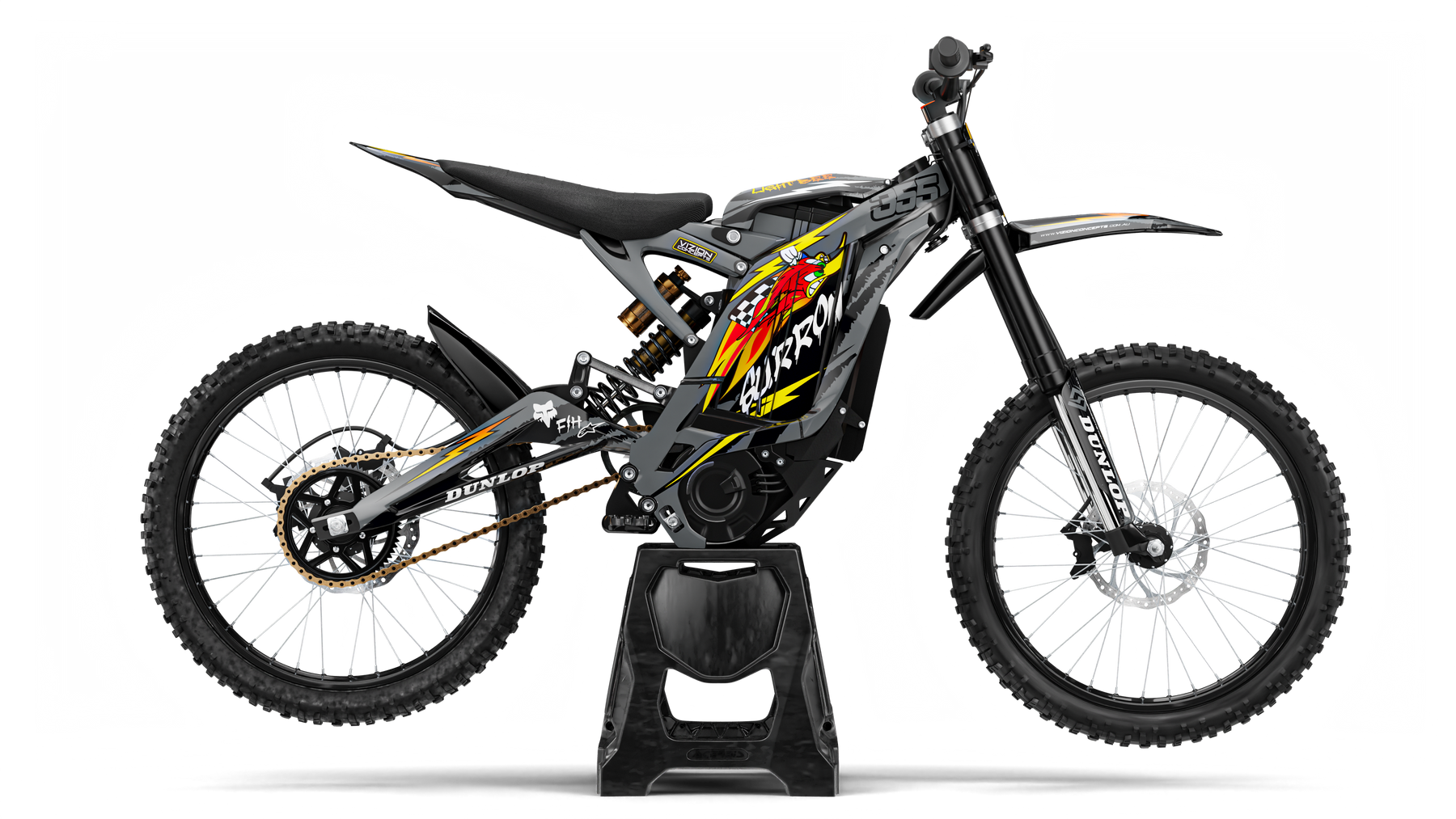 Every panel is cut for an exact fit on your Surron plastics, printed on premium motocross-grade vinyl, and finished with your choice of Glitter, matte or gloss pro laminate. The result? A finish built to dominate — resistant to UV, roost, and mud, keeping your bike looking clean and fierce through every session.